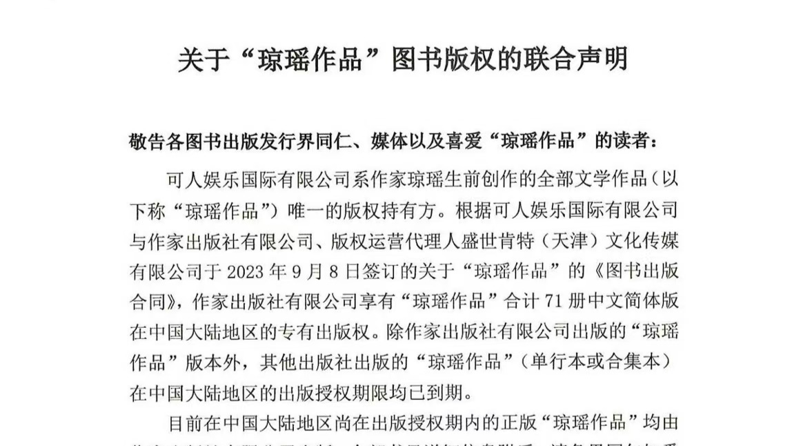 琼瑶巨额版权费如何分配?作家出版社发声,儿媳遏制侵权可人娱乐国际有限公司系作家琼瑶生前创作的全部文学作品唯一的版权持有方。