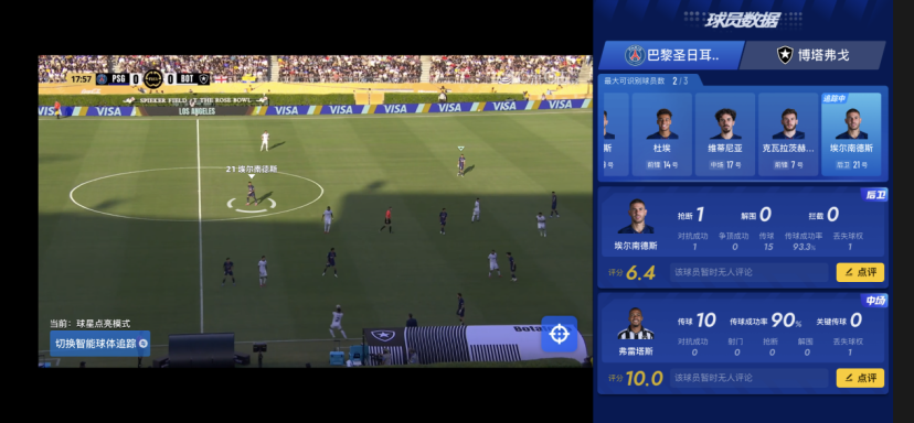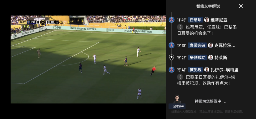 在赛场之外,AI相关的应用也拉近了观众与赛事的距离。依托AI图像识别与智能追踪技术,AI球星跟踪功能可实时检测、跟踪并识别球员,用户点选画面中喜爱的球员即可获取实时统计数据,轻松实现“一键追星”的游戏化观赛互动体验。与此同时,基于中国移动九天大模型及咪咕公司自主研发的百亿级参数文体行业大模型,结合实时赛事数据分析自动生成文字解说,精准覆盖点球、助攻等关键瞬间,解锁智能观赛新体验。